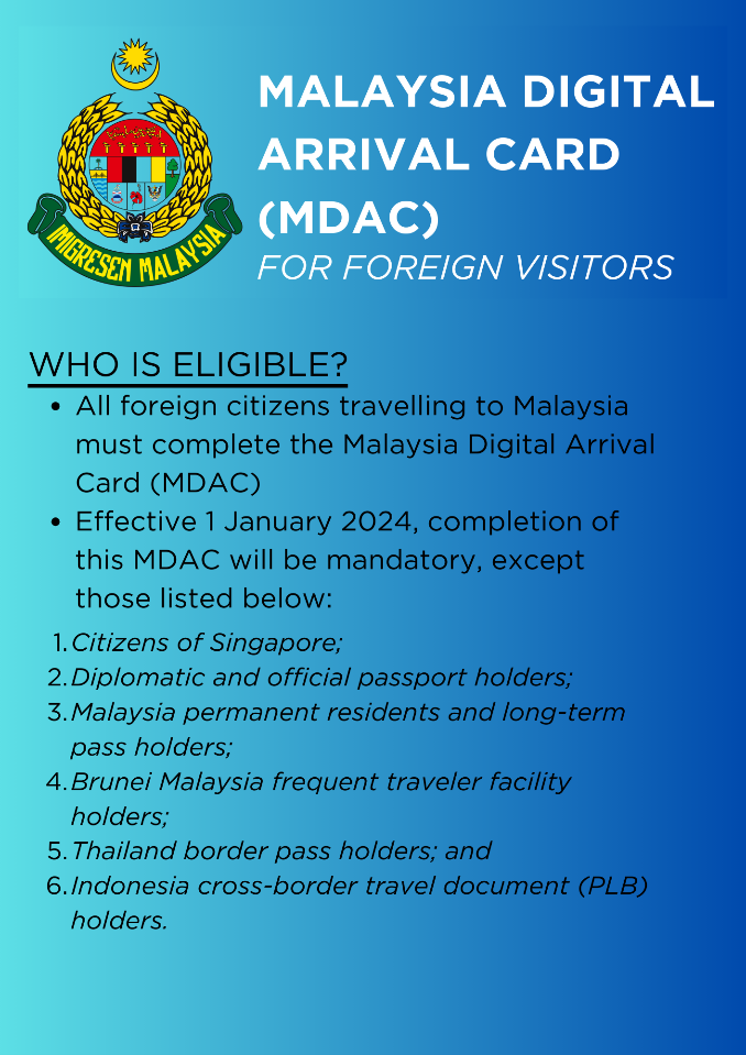 This visa facility application is open to all foreign nationals who require a visa to enter Malaysia for the purpose of studying, working, or other purposes, subject to the approval of a Visa with Reference (VDR/eVDR) or Visa Approval Letter (eVAL), EXCEPT for the following countries which do not require a visa for any purpose of entry: